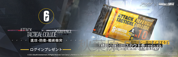 『レインボーシックス シージ』コラボを記念して、期間中にログインすると、「精鋭小隊10回スカウト券」が入手できる。