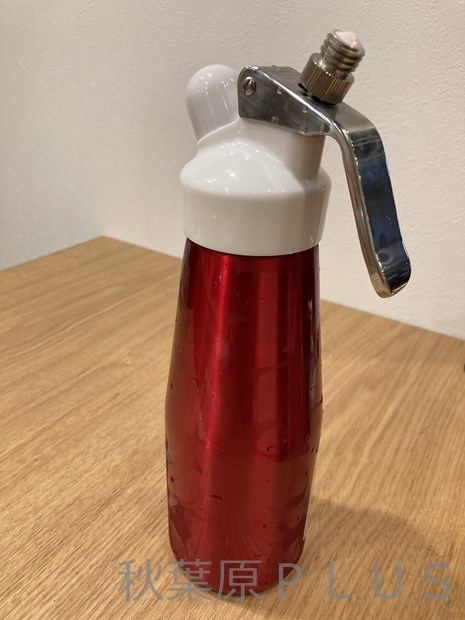 一口入れるとエスプーマと苺ソースの香りが広がり、カキ氷のシャキガリ感が夏にふさわしい。調子に乗って頭がキーンとなって辛い一幕も。でも夏のカキ氷なら頭がキーンとなるまでが作法。ちなみにエスプーマは専用機械でこんな感じでにゅるっと盛ってくれる。