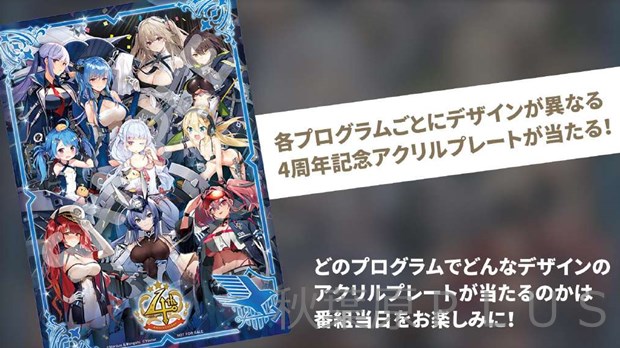 4周年を記念した生番組「アズレン4周年記念生放送 今年もがっつりアズレン三昧!」では、ゲーム内の振り返りや新情報はもちろん、楽しいバラエティ企画もご用意! 4周年を一緒に楽しみましょう!
