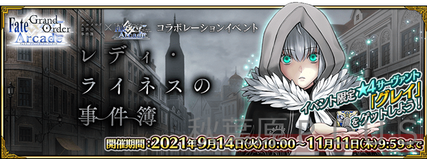 2021年9月14日(火)AM10:00より、コラボレーションイベント「レディ・ライネスの事件簿(以下、本イベント)」を再開催。本イベントは、2021年4月~6月に開催したイベントを、同様の内容で再開催するものだ。本イベントに参加し、イベントを進めることで発生するミッションを達成すると、イベント限定サーヴァント「★4(SR)グレイ」やイベント限定概念礼装「★5(SSR)次期当主会議」、「聖杯」、「伝承結晶」、イベント限定デザインの「称号プレート」などを獲得できる。本イベントで獲得できる報酬は、2021年4月~6月開催時と同じものだ。以前の開催時にイベントに参加したマスター(プレイヤー)も、新たに報酬を獲得することが可能だぞ。