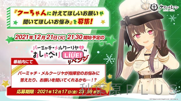 ・内容:アズールレーン4周年生放送の際にお届けした「パーミャチ・メルクーリヤとおしゃべりLIVE」が帰ってきた!今回もクーちゃんことパーミャチ・メルクーリヤが、指揮官の皆さんから寄せられたお悩みや、お願いにリアルタイムでお答えします!