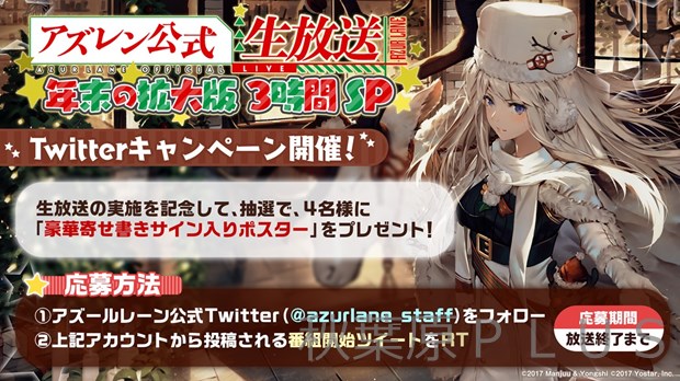 2021年12月21日(火)の「アズレン公式生放送 – 年末の拡大版3時間SP-」の番組配信と同時に、配信記念のTwitter キャンペーンを開催。抽選で4名様に、「番組出演者の寄せ書きサイン入特製ポスター」をプレゼント!