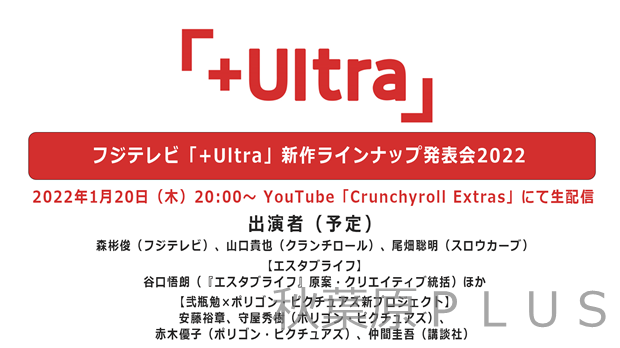 「海外にアニメカルチャーを広げたい」というコンセプトのもと、高品質で世界基準のアニメ作品を、全世界に向けて発信してきたフジテレビのアニメ枠「+Ultra(プラスウルトラ)」。2022年に放送となる新作アニメーションの最新情報を一挙解禁するラインナップ発表会が、2022年1月20日(木)に配信決定となった。