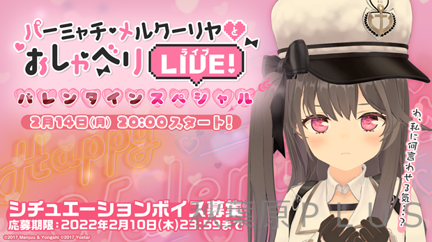 2022年2月14日(月)20時よりバレンタインの特別企画として、アズールレーンのゲーム内に登場するパーミャチ・メルクーリヤがおしゃべりやミニゲームなどに挑戦するライブ配信「パーミャチ・メルクーリヤのおしゃべりLIVE バレンタインSP」を実施することが決定した。当日の配信内では、パーミャチ・メルクーリヤが“とあるミニゲーム”に挑戦したり、指揮官の皆さんから事前にご応募いただいたバレンタインをテーマにしたシチュエーションボイスのお題に体当たりで挑戦したりする。当日は、Twitterの推奨ハッシュタグ「#クーちゃんLIVE」をつけての感想ツイートで一緒に盛り上がろう! パーミャチ・メルクーリヤが投稿された感想などに反応することも? さらにバレンタインデーということで、パーミャチ・メルクーリヤからチョコレートが貰えるチャンスがあるかも…!? 配信当日をお楽しみに!