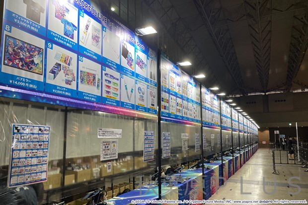 一旦ここでミクさんのアナウンスが入って「また後で会おうね」の声楽屋裏っぽい場面に切り替わる。各グループの舞台裏っぽい? そんな内緒話が流れる中、ちょっと会場の物販の様子をお伝えしておこう。
