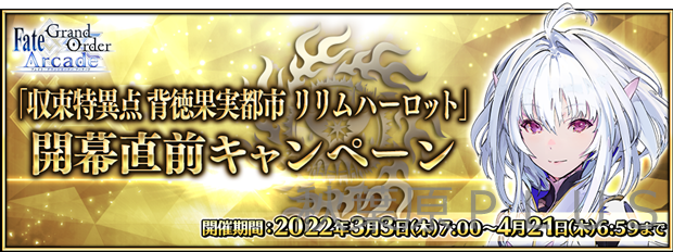 それに先がけて、2022年3月3日(木)AM7:00より、条件のクリアで「★5 サーヴァント選定符」などが入手できる「収束特異点背徳果実都市 リリムハーロット」開幕直前キャンペーンも開催。「収束特異点 背徳果実都市 リリムハーロット」開幕直前キャンペーンの詳細はこちらをご確認ください。