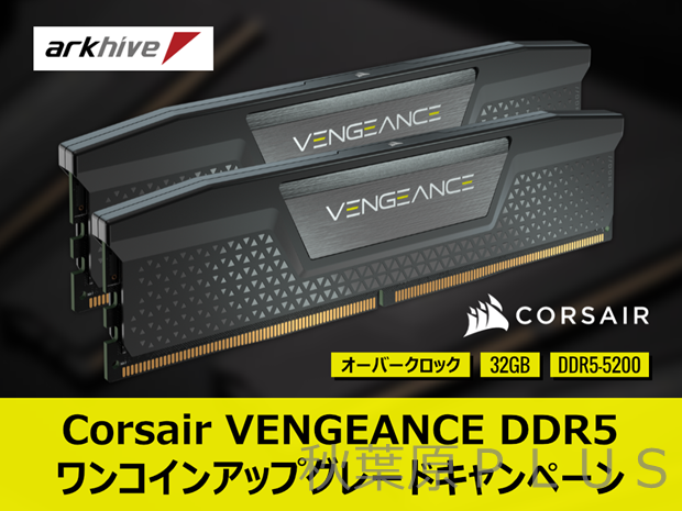 メイドイン秋葉原のBTOゲーミングパソコン「arkhive」ブランドの一部モデルを対象に標準採用DDR5メモリーからCorsair製DDR5オーバークロックメモリー「VENGEANCE 32GB (2x16GB) DDR5 DRAM 5200MHz C40 型番: CMK32GX5M2B5200C40」へワンコイン(+500円)でアップグレードできるお得なキャンペーンを開催中。開催期間は2022年3月10日(木)から2022年4月3日(金)23:59まで、用意数に達した場合は早期終了する場合があるとの事だ。